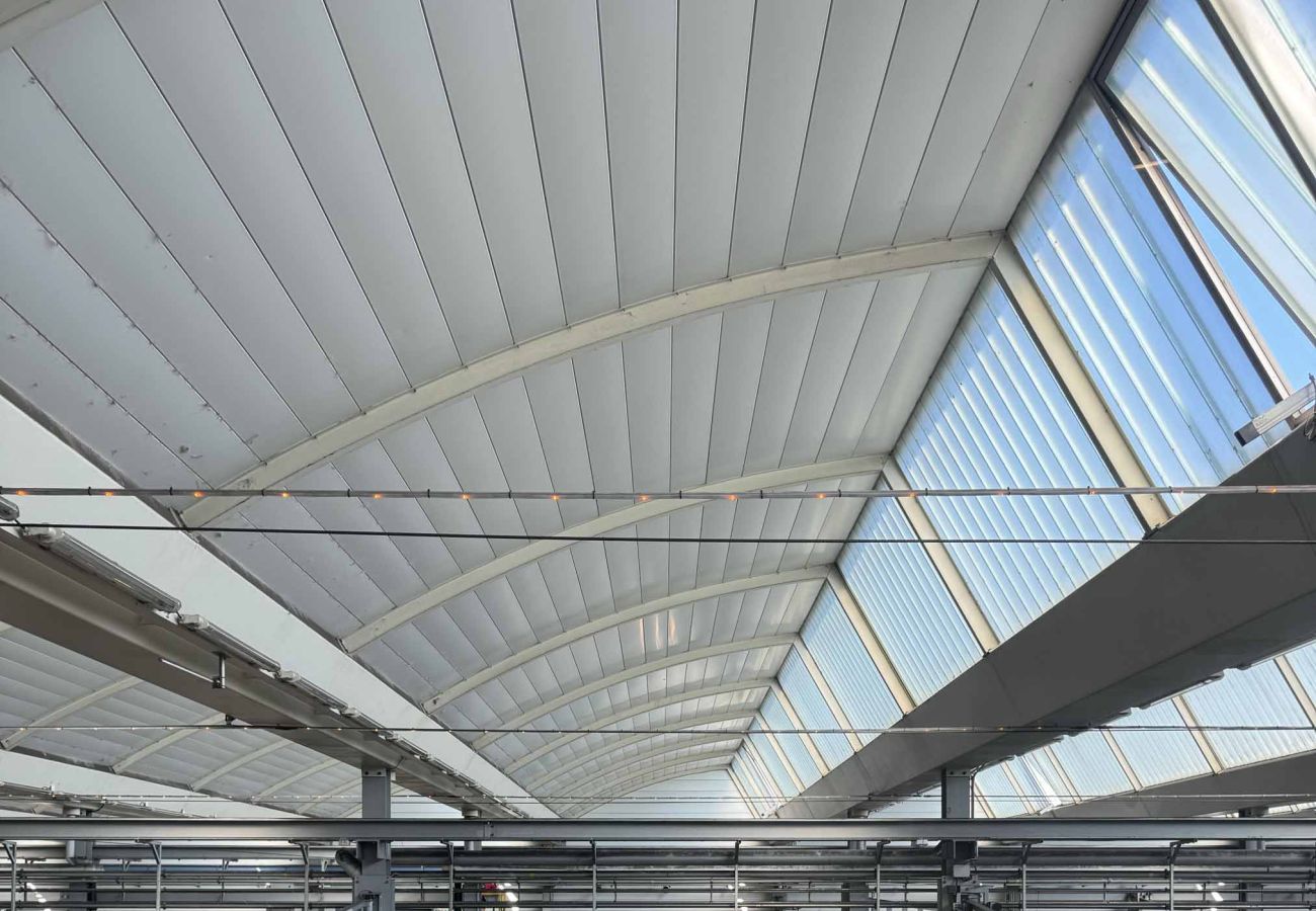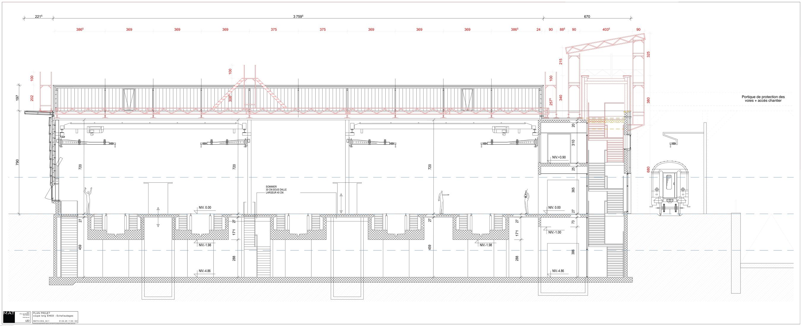 L’entretien des trains impose des contraintes comparables à celles de l’industrie automobile : les équipes doivent pouvoir accéder sous les rames pour intervenir sur les éléments techniques assurant le roulement et le confort des passagers. Puisque le levage complet d’un train n’est pas possible, le bâtiment a été conçu avec un système de rails sur pilotis, permettant au train d’avancer au-dessus de fosses de travail accessibles sur toute sa longueur.